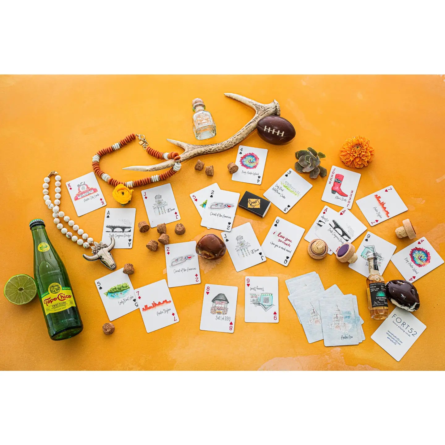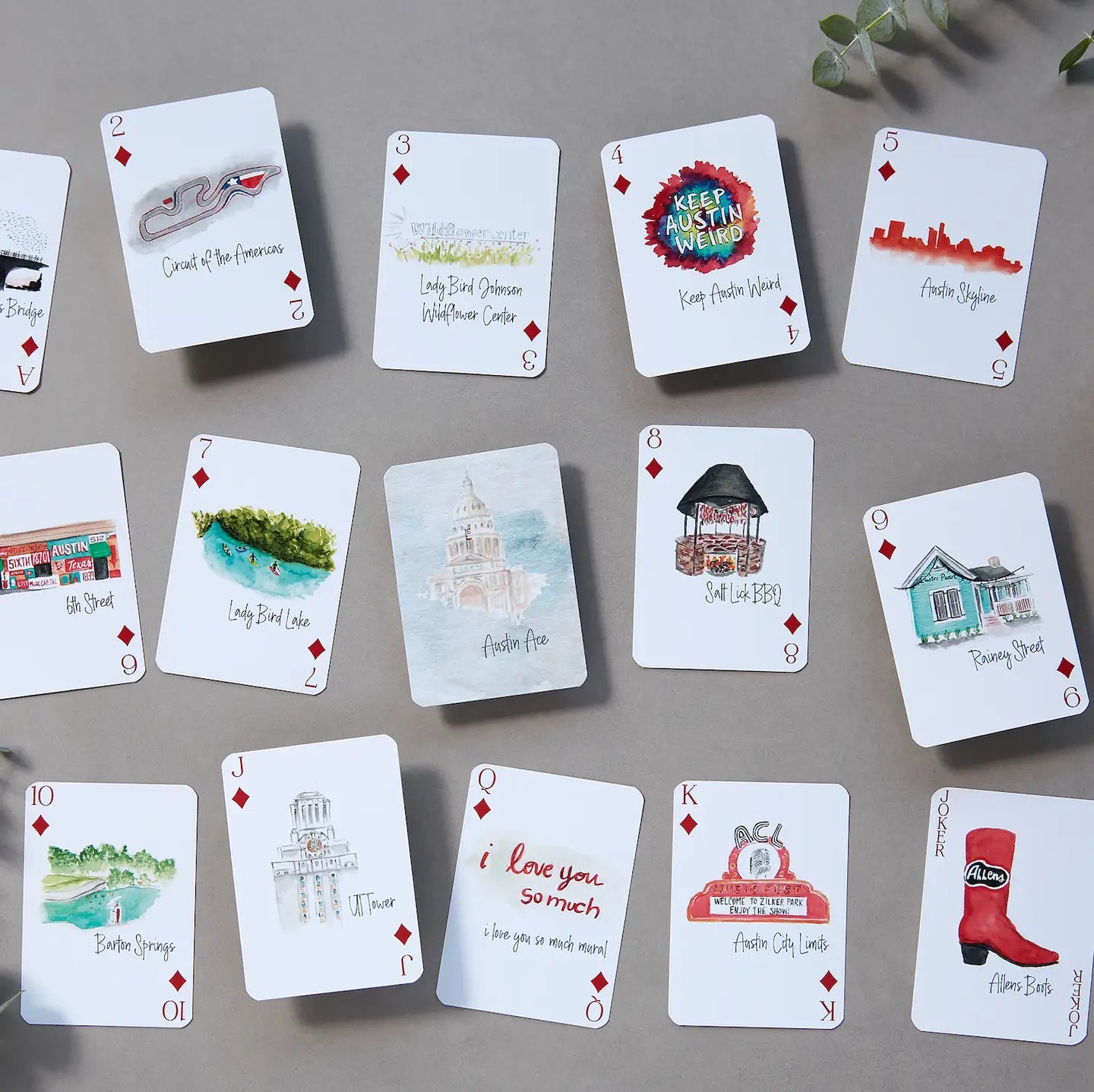 Austin, Texas themed playing cards featuring 15 different unique watercolor images. Including South Congress Bridge, Circuit of the Americas, Wildlife Center, Keep Austin Weird, Downtown, 6th Street, Lady Bird Lake, Salt Lick BBQ, Rainey Street, Barton Springs, UT Tower, I Love You So Much, Austin City Limits, Allens Boots and the Capitol Building.