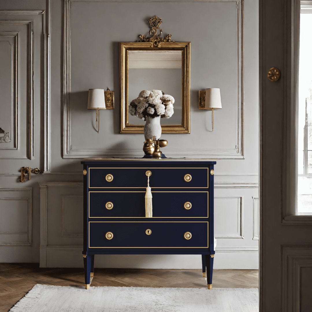 Manoir's exquisite Gustavian Dresser draws inspiration from the Gustavian style, a Swedish design movement of the 18th century featuring a pared back style influenced by French elements. The deep navy color adorned with a beautiful gold key tassel, adds a touch of sophistication and refinement that is at home equally in classic or modern interiors. Fine moldings gracefully frame the drawers, while the solid brass fittings lend an air of luxury. Crafted with utmost care from sustainable Acacia wood, this dresser features three spacious drawers for ample storage.