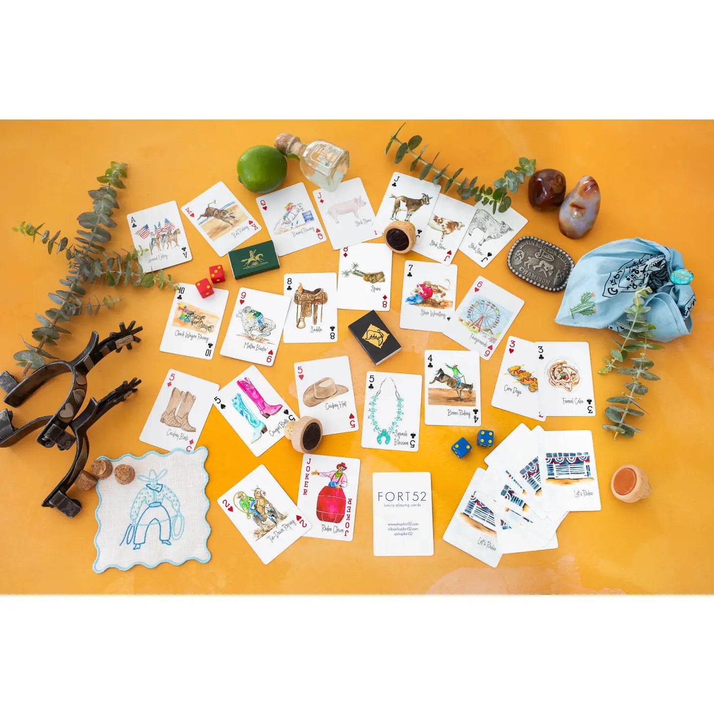 A Rodeo theme deck of playing cards featuring popular rodeo watercolor imagery, including Grand Entry, Tie-Down Roping, Funnel Cakes, Corn DogsBronc Riding, Cowgirl Boots, Cowboy Boots, Spurs, Squash Blossoms, Fairgrounds, Steer Wrestling, Saddles, Mutton Bustin', Chuck Wagon Racing, Stock Show Animals (goat, sheep, corn and pig) Barrel Racing, Bull Riding and Rodeo Clown.
