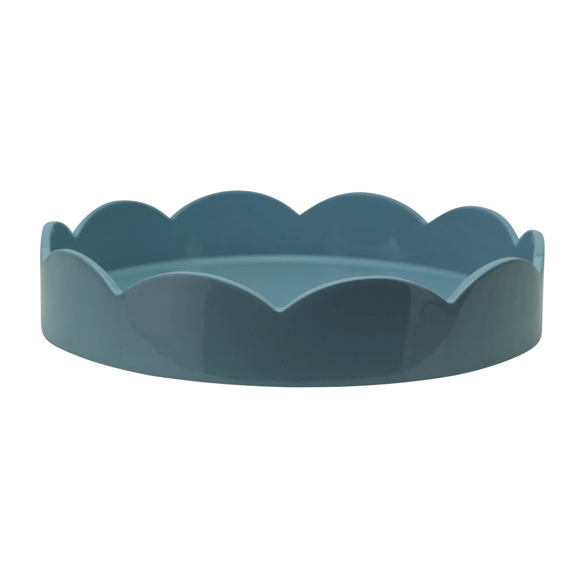 A pretty pale denim blue round scallop small tray finished in 20 coats of high gloss lacquer, hand polished between each coat. The base is painted black satin.
